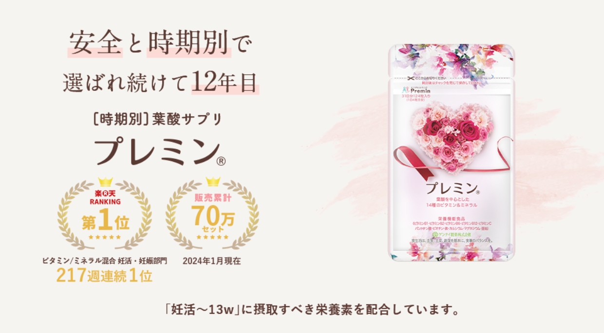 「プレミンママ」は、ゲンナイ製薬株式会社が2017年から提供している「プレミンシリーズ」のひとつです。プレミンシリーズは、妊活中から妊娠期、出産、そして産後・授乳期まで、ライフステージに合わせた栄養補給をサポートする葉酸サプリメントとして、多くの方に選ばれています。