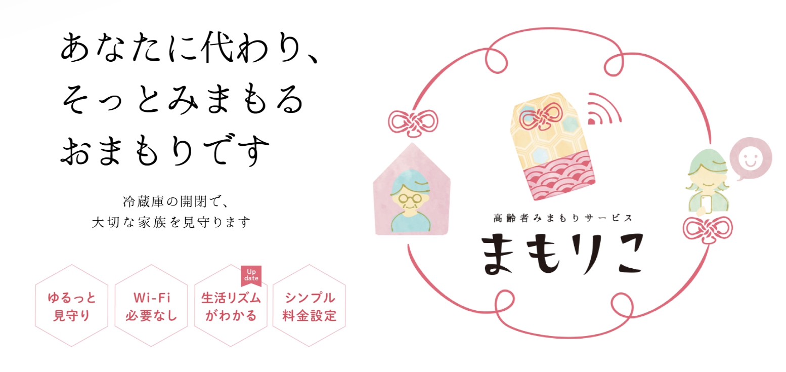まもりこは、冷蔵庫に小さな端末を設置するだけで、一人暮らしの高齢者の「生活の様子」を遠くから見守ることができる見守りサービスです。