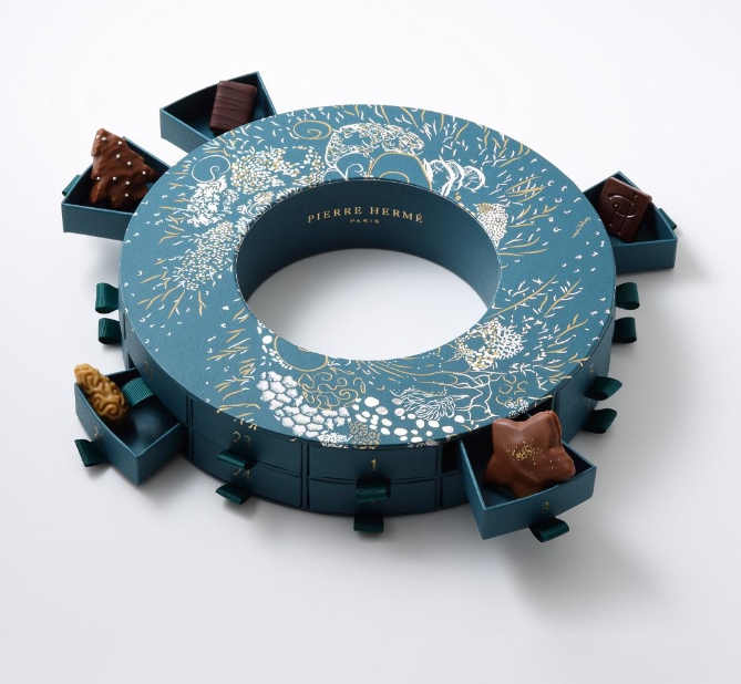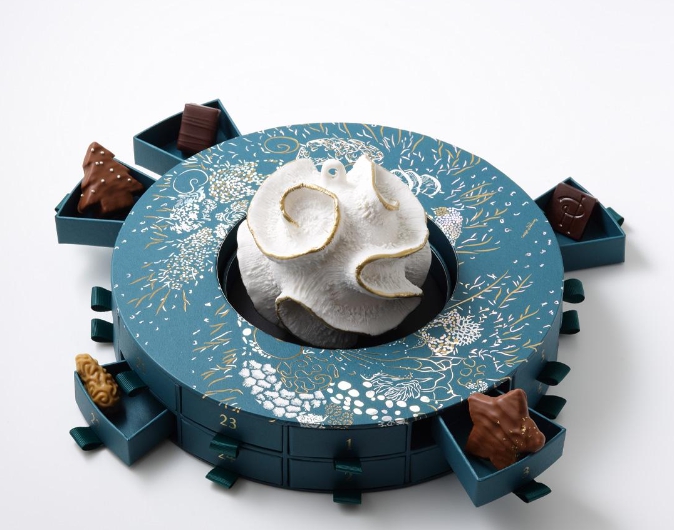 ピエール・エルメといえば、毎年“アドベントカレンダー”が話題になりますが、2025年版でもその存在感は健在です。円形ボックス+引き出し構造という独自フォーマットは今年も踏襲されつつ、テーマ「深海」を反映する造形と配色で刷新されました。