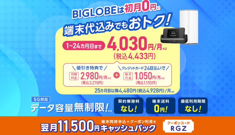 BIGLOBEのキャンペーンを利用すると、1〜24ヶ月目:4,030円(税込4,433円)/月(内訳:月額料金2,980円+端末代分割1,050円)で利用可能。25ヶ月目以降は4,480円(税込4,928円)/月に切り替わります。支払期間や特典の条件は申込ページで要確認です。