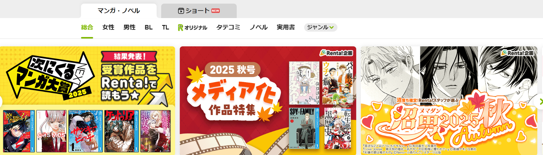 Renta!では、サイトスタッフによるおすすめ作品特集や人気ランキングも充実しています。