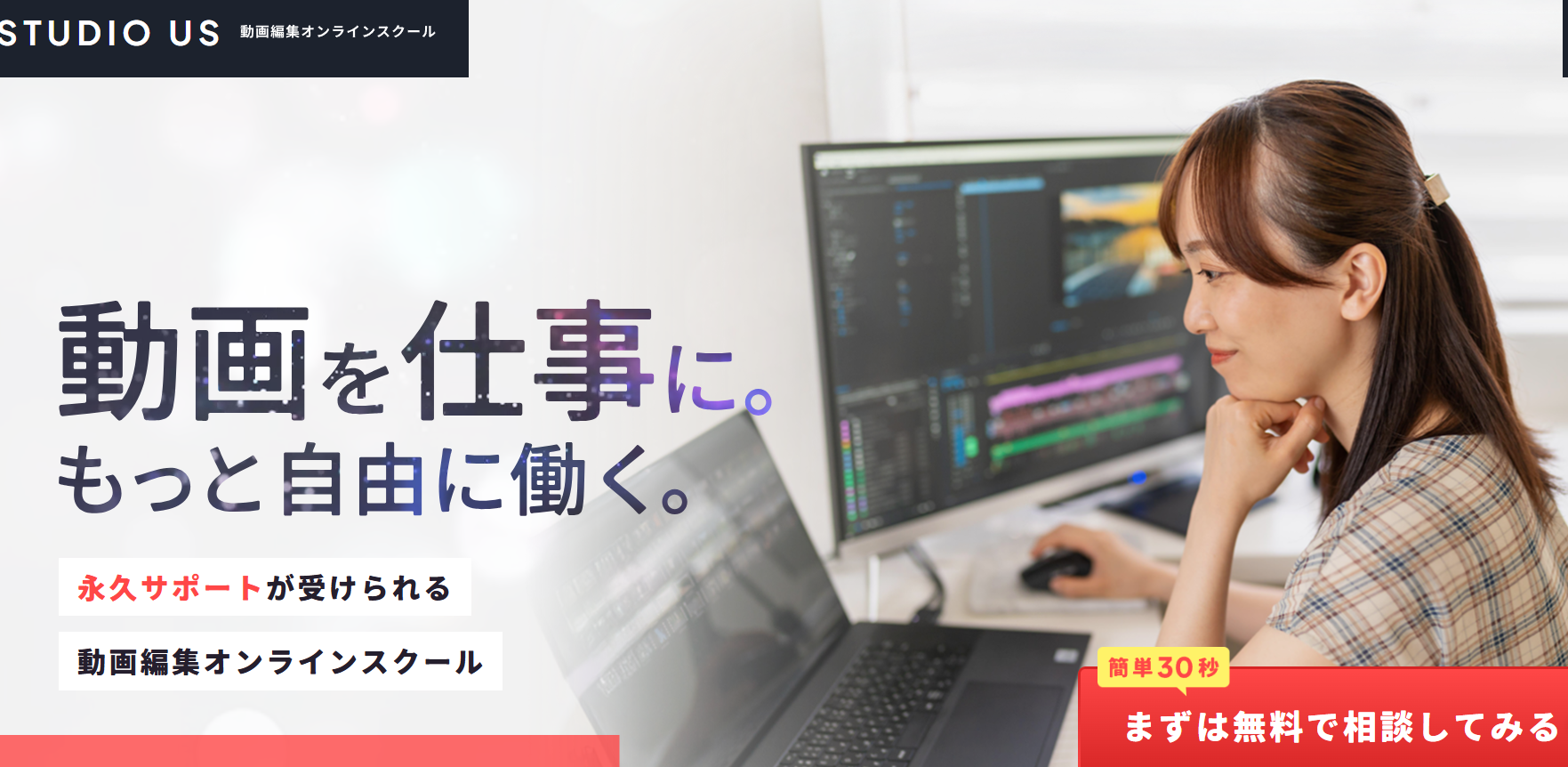 「studio US」は、完全オンラインで学べる動画編集スクールです。動画編集初心者でも安心して学べるカリキュラムが整っており、最短で仕事にできるスキルを習得できます。