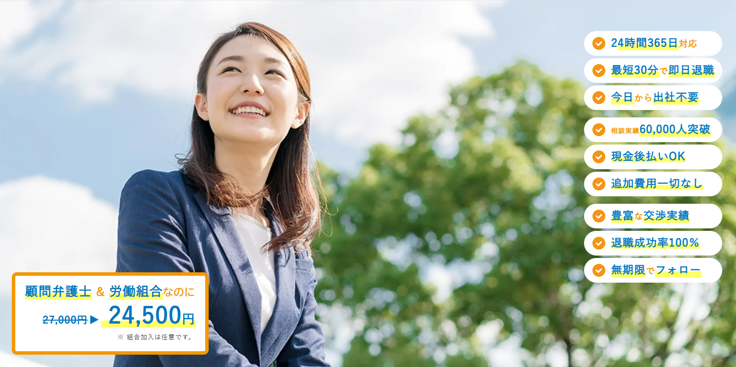- 24時間対応・最短30分で手続き開始:深夜や早朝でも相談でき、急ぎの退職希望でもスピード感があるとされる。