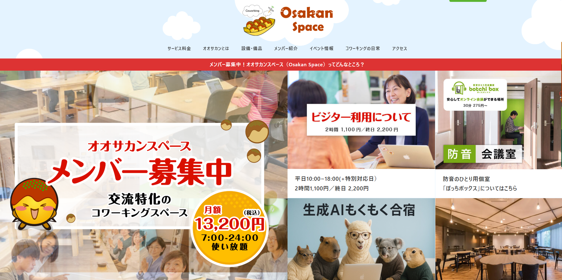 大阪・本町にあるコワーキングスペース「オオサカンスペース」は、仕事も交流も充実できる場所として注目されています。約40坪(106平米)の広さに52席を完備し、電源や高速Wi-Fiはもちろん、防音の会議室「ぼっちボックス」も自由に使えます。明るく開放的な空間で、アットホームな雰囲気が特徴。活発なコミュニティで新しいつながりが生まれるコワーキングスペースです。