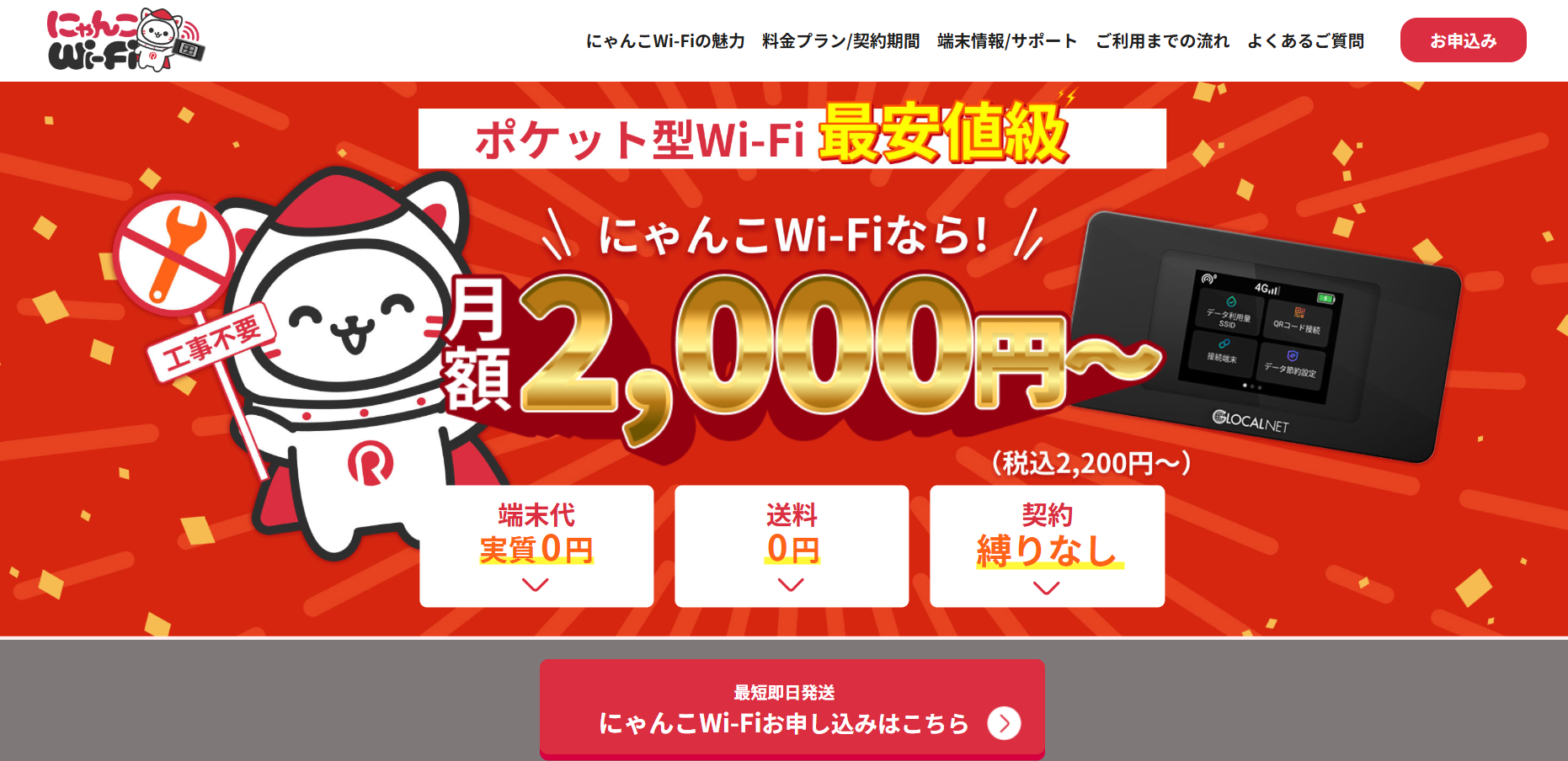 “縛りなし×格安×工事不要”を実現したポケットWi-FiサービスにゃんこWi-Fiです。