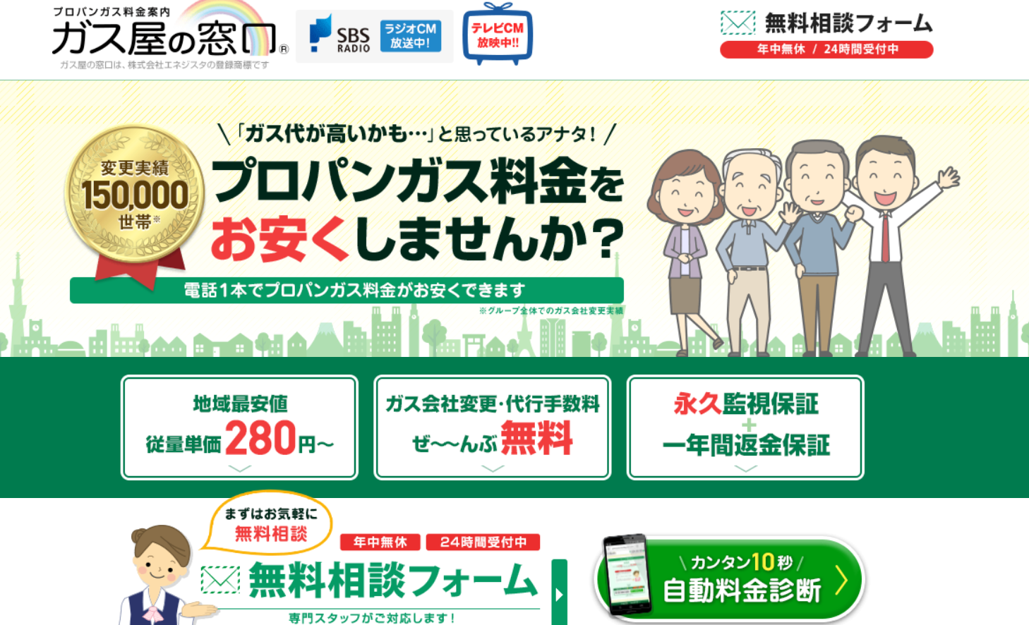 「ガス屋の窓口」は株式会社エネジスタが運営する、プロパンガスの料金見直し・ガス会社乗り換え支援サービスです。